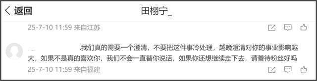 孕期出轨风波发酵之后,经纪公司却没有继续硬刚。田栩宁在风波发酵之后还有心情点赞自己的路透集采优配,本人评论区沦陷,不少粉丝希望他能单独针对网传孕期出轨的问题再次做出澄清,还呼吁他能善待粉丝,不要冷处理。